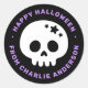 Des autocollants ronds Happy Halloween avec un crâne blanc mignon et des étoiles. Autour du crâne, il y a du texte personnalisé dans une police violette et en gras "Happy Halloween" et votre nom. Arrière - plan noir. Toutes les couleurs sont personnalisables.