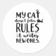 Un design graphique drôle et audacieux pour les propriétaires de chats qui connaissent leurs animaux de compagnie sont responsables! Cet art typographique présente la citation : "Mon chat ne suit pas les règles, il en écrit de nouvelles." Avec une icône et un empreinte de patte de chat stylisé, il est parfait pour les t-shirts, les tasses, ou comme art mural pour célébrer l'anarchie ludique de votre félin préféré.