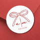 Sticker rond Monogram Classic Mariage Whimsical Main Drawn Red Bow. Stickers Mariage Rond Minimaliste. Ces autocollants ronds mignons et simples sont la touche parfaite pour sceller des enveloppes, décorer des faveurs ou ajouter un élément personnalisé à vos détails mariages. Au centre, un arc dessiné à la main est jumelé aux initiales et à la date mariage de la mariée et du marié, créant un design intemporel et sobre. Décoré dans une palette classique rouge et blanc, le design évoque l'esthétique italienne, française et européenne pour un style élégant. Dotés d'un mélange d'écriture manuscrite et d'une police simple et propre, ces autocollants sont élégants mais accessibles. Entièrement personnalisable, vous pouvez ajuster le texte et la mise en page en fonction de votre thème mariage. Parfaits pour les mariages, les dîners de répétition ou les douches nuptiales, ces autocollants sont un complément versatile et charmant à votre célébration.
