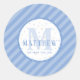 Autocollant rond monogramme personnalisé pour bébé garçon. Initiale, nom et date personnalisés entourés des étoiles et des rayures diagonales. Baby shower parfait ou la première fête d'anniversaire ou l'idée d'emballage cadeau. Couleur kaki pastel bleu, blanc et doux. Ajoutez le nom et le monogramme avec l'outil d'édition Zazzle facile à utiliser! Visitez le magasin pour voir toute la collection. Il y a des bannières, des bouquets, des ballotins, des bouteilles d'eau, des costumes et bien plus encore. Et bien sûr, des distributeurs de boissons alcoolisées et de masques sont aussi dans la boutique !