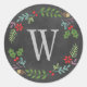 Le design autocollant rustique de style tableau de bord de mer de vacances comprend une couronne de fleurs boisées avec un monogramme initial. La couronne comprend des feuilles saints de Noël, des baies, des branches de pins et des glands qui encadrent la lettre. L'arrière - plan a une apparence noire de tableau noir texturé. Le design comprend le rouge, le pourpre poussiéreux, le vert, le bleu glacé, le brun, le gris et le noir doux.