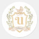 Ce joint d'enveloppe de faire-part douce pour bébé comporte une crête monogramme avec un chariot de bébé dans un jeu de couleurs neutres.