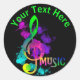Un autocollant amusant et coloré pour une soirée ou un événement à thème musical avec une note de clef de musique de couleur arc-en-ciel triplée dans un effet abstrait de peinture éclaboussant qui vient juste de apparaître sur le noir. Si facile à personnaliser avec votre choix de texte sans frais supplémentaires.