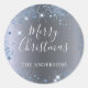 Un arrière - plan métallique à l'aspect faux argent, décoré de poussière de parties scintillant bleue et faux argent. Personnalisez et ajoutez votre nom de famille. Le texte : Joyeux Noël est écrit avec un script de style, des lettres, écrit à la main moderne. Texte bleu.