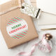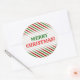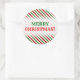 Ce modèle d'autocollant rond de Noël comporte un motif de rayures rouges, blanches et vertes. Ce sont des couleurs communément associées à Noël. Il présente également l'accueil chaleureux, "MERRY CHRISTMAS !", en texte rouge et vert. [~Z0000114]