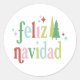 Cet autocollant ludique présente le dicton "Feliz Navidad" avec des couleurs alternées et des accents pétillants. Les couleurs sont rose, rouge, vert et bleu clair.