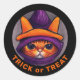 Sticker Rond Orange Chat Violet Sorcière Casquette Treat Hallow