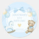 Image d'anniversaire avec un arrière - plan bleu, avec un ours avec un arc bleu autour du cou, un cheval blanc à bascule avec des points bleus, des ballons bleus et beiges