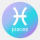Un ensemble d'autocollants ronds avec le symbole astrologique pour Pisces sur un arrière - plan bleu et violet dégradé. Pour quelqu'un dont l'anniversaire est entre le 19 février et le 20 mars.