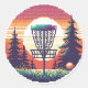 Illustration d'un parcours de golf à disques avec panier, pins et couché de soleil dans un style de vibes de jeu d'art 8 bits.