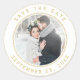 Ce mariage enregistrer la date autocollante dispose d'élégants cadres cercle de parties scintillant en or avec une photo et de la calligraphie simple.