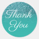 Photo de turquoise couplée à un ombre turquoise foncé. Le message texte "Merci" dans un joli style de calligraphie est personnalisable. Turquoise et turquoise merci autocollants autocollants. Design art numérique photo chic pour un quinceañera, mariage ou autre événement spécial. Faux parties scintillant design imprime comme une photo.