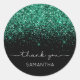 Une bordure de parties scintillant verte turquoise et étincelante contre une couleur arrière - plan noire. Vous pouvez changer la couleur de la police de calligraphie fluide "merci" graphique vectorielle numérique. Le style de police moderne de son nom est entièrement personnalisable. Fille glam turquoise, jade, émeraude, vert et noir personnalisées anniversaire merci enveloppe collants ronds classiques sceau.