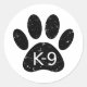 Un mignon empreinte de patte de chien de style dessin animé et texte avec l'effet grunge et angoissé appliqué à l'image. Autocollants personnalisés avec thème K9. Idée cadeau.