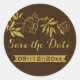 Feuilles d'or vintages pivoines mariage floral Enregistrer l'autocollant Date avec effilé feuille d'or fleur de pivoine sauvage sur arrière - plan brun, avec l'adorable police de script carolyna. Ce design élégant, élégant et élégant fait partie d'une collection ou d'un ensemble mariage. Il s'agit d'un modèle entièrement personnalisable, parfait pour un mariage moderne et contemporain ou traditionnel automne/automne ou hiver. Notez qu’il n’y a pas de véritable feuille d’or mais juste des images imprimées.