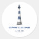 Un phare dessiné à la main dans un thème bleu et blanc. Le nom et la date du couple sont en dessous. C'est un joli ajout pour envoyer des invitations, des cartes rsvp, et même les ajouter aux faveurs de mariage.
