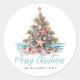 Sticker rond classique Arbre de Noël Plage. Étalez un peu de gaieté côtière avec cet autocollant rond festif avec un sapin de Noël inspiré de la plage fait de coquillages et surmonté d'une étoile de mer. Parfait pour envoyer des voeux de vacances en plage, cet autocollant est idéal pour toute personne vivant dans des endroits tropicaux comme Hawaii ou pour ceux qui aiment une ambiance côtière. Le design présente l'arbre centré sur une base de sable avec des vagues océaniques turquoises douces en arrière - plan. Sous l'arbre, "Joyeux Noël" est écrit en écriture élégante, ajoutant une touche festive. Le style rustique de l'aquarelle et le mélange de typographie simple et de script lui donnent un aspect décontracté mais poli. Idéal pour décorer les enveloppes de cartes de Noël, les fêtes ou tout décor de vacances avec une touche tropicale.