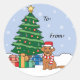Étiquette vos cadeaux de Noël avec un autocollant cadeau de Nova Scotia Duck Tolling Retriever. Il présente l'illustration d'une race de chien d'une poussette assise devant un sapin de Noël décoré avec des cadeaux emballés sous le toit. C'est l'ajout parfait à tout cadeau pour vos amis amateurs de chien!