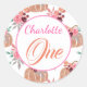 Joli automne floral rose citrouille arrière - plan premier anniversaire classique rond autocollant avec votre nom personnalisé dans un joli script rose et le mot "One" dans un élégant script orange. Vous pouvez facilement ajouter le nom de votre choix et modifier la couleur et la police en utilisant l'option personnaliser !