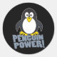 Un autocollant de pingouin stylisé avec les mots "Pouvoir de pingouin !", symbole du système d'exploitation Linux.