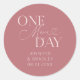 Dîner de répétition minimaliste mariage préférez l'autocollant avec le texte de typographie qui dit "un jour de plus". L'arrière - plan est rose poussiéreux.