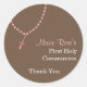 Ce design d'autocollant rond de communion contemporain présente un chapelet rose sur un arrière - plan au chocolat. Personnalisez cet autocollant avec vos propres détails et votre propre libellé. Graphique par Jessicaweible.com