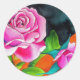 D'une aquarelle d'art originale de l'artiste Sacha Grossel, ce tableau lumineux et vibrant représente deux roses roses vives en fleur contre un arrière - plan à texture orange et foncée. Contemporain et moderne, ce design est coloré et tonifiant.