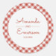 Un autocollant mariage amusant avec le nom du couple mariage et la date du mariage entouré d'un motif en vichy chèque rouge et blanc. Idéal pour les faveurs, merci, enveloppes scellées, etc.