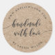 Autocollant rond rustique avec les mots "fait main avec amour" dans un script de relaxation cursive en gris foncé contre un arrière - plan motif imitation kraft. Personnalisez-le en remplaçant le texte de l'espace réservé. Pour plus d'options comme changer la police et sa taille/couleur, développer la courbe /contrat ou l'espacement entre les lettres cliquez sur le bouton "Personnaliser". *Veuillez noter que le filigrane Zazzle qui apparaît dans l'aperçu du zoom n'apparaîtra PAS sur le produit imprimé final. © Bois de rose et agrumes