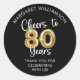 Sticker rond Merci à ballon à 80 ans. Utilisez ces autocollants festifs de faveur pour remercier vos invités de célébrer votre invité d'honneur à une fête du 80e anniversaire. Ces autocollants de couleurs personnalisées ont un nom, un design CHEERS TO 80 YEARS avec des numéros de ballon en or métallique et typographie de script moderne et votre message personnalisé ci-dessous (l'exemple dit MERCI FOR FLEBRATING With US!). L'exemple montre du texte blanc sur un arrière - plan noir ; vous pouvez modifier le texte et les couleurs arrière - plans pour les coordonner avec les couleurs de votre thème de soirée dans EDIT. ASSISTANCE : Pour obtenir de l'aide sur la modification ou la personnalisation de la conception ou pour coordonner des éléments, contactez le concepteur AVANT de commander par Zazzle Conversation ou par courriel makeitaboutyoustore@gmail.com.