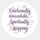 Embrace your need for "me time" with this funny and relatable graphic. Featuring the sassy quote "Emotionally Unavailable, Spiritually Napping" in a whimsical purple font, this design is surrounded by cute, sleepy clouds and stars. It's the perfect statement for introverts, or for anyone who is feeling drained and is officially checking out for a spiritual nap.