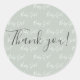 Autocollant rond sage vert bébé fille avec écriture blanche “Merci”. Tellement mignon.