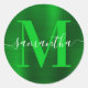 Créez votre propre nom personnalisé et des autocollants monogrammés d'enveloppe pour son événement spécial. Image couleur art numérique couleur émeraude fausse feuille. Monogramme contemporain vert et blanc clair avec design de calligraphie de style signature élégant sur un autocollant rond classique.
