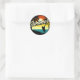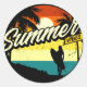 Design de style rétro avec texte "Vies d'été" avec coucher de soleil tropical et silhouette féminine surfer