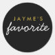 Autocollant Rond "Son Snack Préféré" en Noir Or et Blanc Collez cet autocollant sur le snack préféré de la mariée ! Autocollants pour toutes vos occasions de mariage - fête de fiançailles, dîner de répétition, cérémonie, cocktail, réception de mariage, brunch du dimanche, douche de mariée, enterrement de vie de jeune fille, fête des poules et plus encore ! Montrez son snack ou friandise préféré en guise de faveur pour vos invités. Disponible en différentes tailles, couleurs et polices