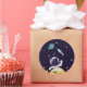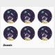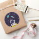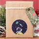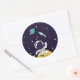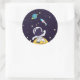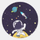 Un autocollant avec un arrière - plan bleu foncé avec des étoiles jaunes éparpillées autour. Couché sur le dessus est l'illustration d'un astronaute vêtu d'une combinaison blanche flottant au-dessus de la lune. Au loin se trouve une planète avec des anneaux et un vaisseau-fusée qui s'envole dans le ciel à la recherche de nouveaux mondes à explorer.
