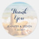 Un autocollant de remerciement pour un mariage ou un autre événement. Conçu avec une photo mignonne d'une étoile de mer placée debout dans le sable. Sous ses bras se trouvent 2 petits coquillages reposant confortablement. Installé sur une plage aux vagues qui s'écrasent dans l'arrière - plan.