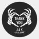 Un mariage noir vous remercie les autocollants de la collection "Jusqu'à ce que la mort nous sépare". Il comporte des mains squelettes éffrayantes formant un coeur sur le devant. Le parti fournit une date modifiable et les initiales ou noms de la mariée et du marié. N'oubliez pas de visiter notre collection pour voir plus d'éléments de coordination qui correspondent à cette conception pour votre événement spécial.