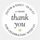Ajoutez une touche personnalisée élégante à la réception de mariage ou à la fête de la douche nuptiale avec des autocollants ronds "un gentil merci" personnalisés. Tout le libellé de ce modèle est simple à customiser pour les scellés de sac de traitement ou les étiquettes cadeaux. Le design moderne minimaliste noir et blanc présente un coeur en faux feuille d'or et une typographie classique chic. Veuillez noter que l'or est imprimé en couleur et non en métal. Ces étiquettes ajoutent une touche customisée unique aux cadeaux sucrés, tels que des bonbons, des chocolats et des biscuits, et sont une façon élégante de remercier les invités d'être venus à une fête spéciale.