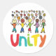 Le design de l'unité est composé d'une foule de différents personnages en allumettes qui se tiennent au-dessus de la grande lettrage UNITY. Graphique coloré et chaleureux pour montrer la puissance et la joie dans l'Unité.