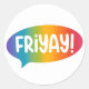 Le mot 'Friyay !' dans une bulle de discours couleur arc-en-ciel. Les lettres manuscrites excentriques sont de couleur blanche. L'arc-en-ciel est composé de violet, bleu, vert, jaune, orange, rouge et rose. Le design repose sur un arrière - plan blanc simple mais efficace. Préparez-vous pour le week-end avec ces autocollants branchés et modernes !