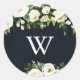 Cet autocollant blanc vert fleuri bleu monographie classique mariage rond est parfait pour un mariage rustique. Le design est composé d'élégantes pivoines blanches aquarelles avec feuillage vert dans un arrière - plan bleu foncé. Personnalisez les étiquettes avec la dernière initiale de la mariée et du marié.