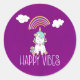 Un autocollant avec une jolie illustration d'une licorne blanche assise sur sa croûte, souriant et joyeux. Des nuages souriants et un arc-en-ciel au-dessus. Texte : Happy Vibes. Image de levage adorable Placé sur un arrière - plan d'aquarelle rose violet.