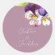 Ces autocollants romantiques de mariage ont un design floral. L'arrière - plan est un violet roux simple et élégant avec des violettes aquarelles. Un délicat bouquet de fleurs violettes est en haut à droite, avec les noms du couple imprimés ci-dessous.