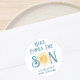 Cet autocollant de baby shower de garçon mignon présente le texte "Here Comes The Son" en typographie rétro bleue avec un soleil d'aquarelle jaune souriant. Facile à personnaliser. Aquarelle originale © Michele Davies.