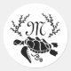 Tortue de mer nageant dans un style tribal silhouette. Alors que l'original était une base d'une tortue verte, la forme des segments qui s'inclinent pour être tordus et tournés. Au-dessus de la coquille à gauche et à droite est l'algue noire laissant de l'espace pour le texte, par défaut est une lettre "M" m est courte pour monogramme. Et sous la tortue se trouvent des tourbillons d'eau.