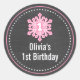 stickers personnalisés rose flocon d'hiver thème 1er anniversaire de fête. Le design comporte un flocon de neige rose sur un arrière - plan de tableau noir. Parfait pour les toppers de cupcake ou les autocollants de sacs préférés.