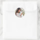 A pretty sticker with an illustration of a woman holding a white fluffy cat surrounded by dandelions, The picture has a crochet style fabric look.