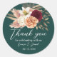 Un autocollant de remerciement rond avec des fleurs de saumons boho romantiques en bordeaux, ivoire, et pêche sur un arrière - plan vert émeraude profond. Parfait pour sceller des sacs de faveur ou des cartes de remerciement à votre réception de mariage. Une partie de la suite Rustic Emerald & Burgundy Floral. Pour obtenir de l'aide : bpkolman@gmail.com