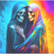 LGBTQIA+ Deux Skeletons se tenant sous une couverture avec un arrière - plan arc-en-ciel.